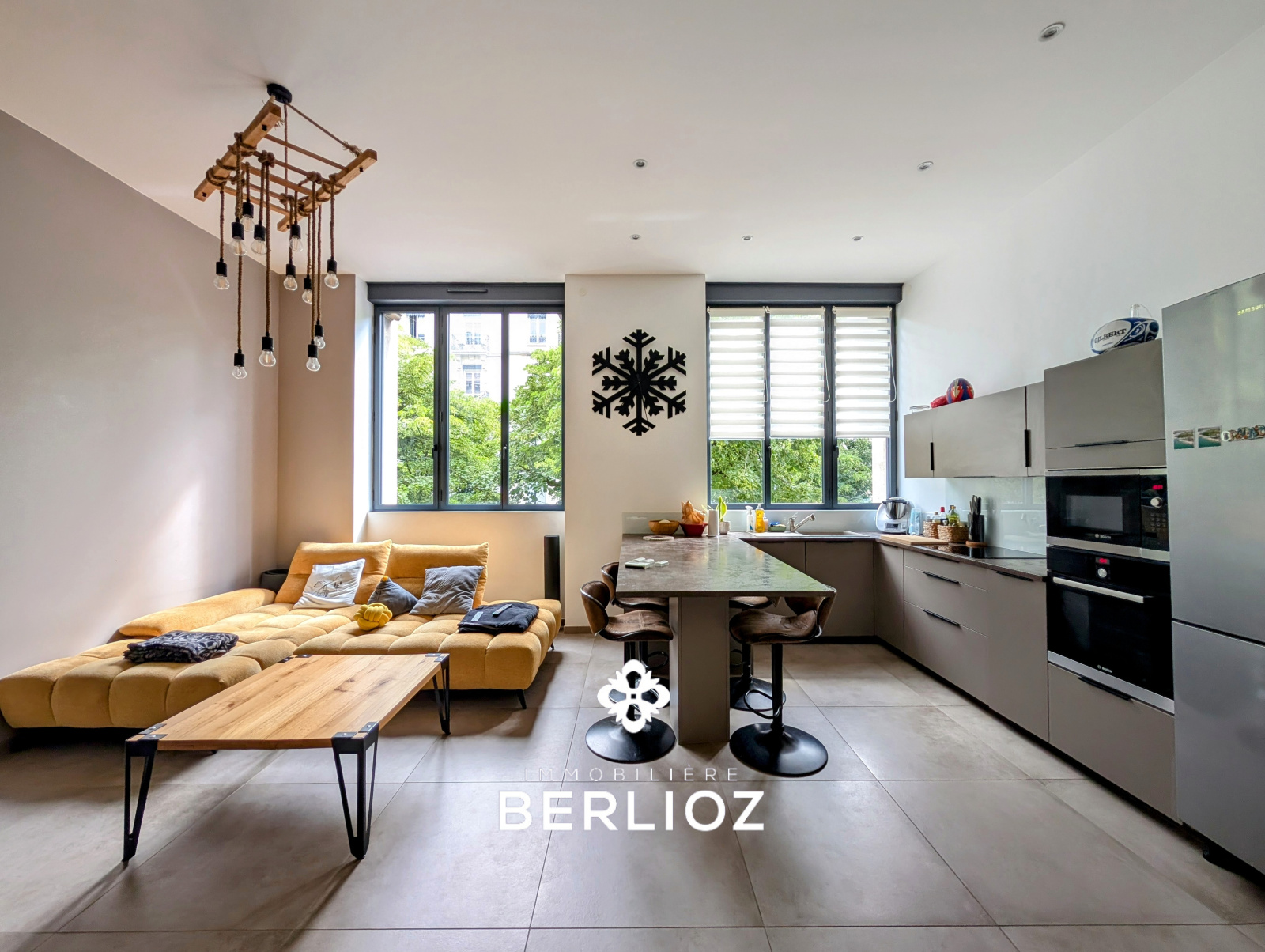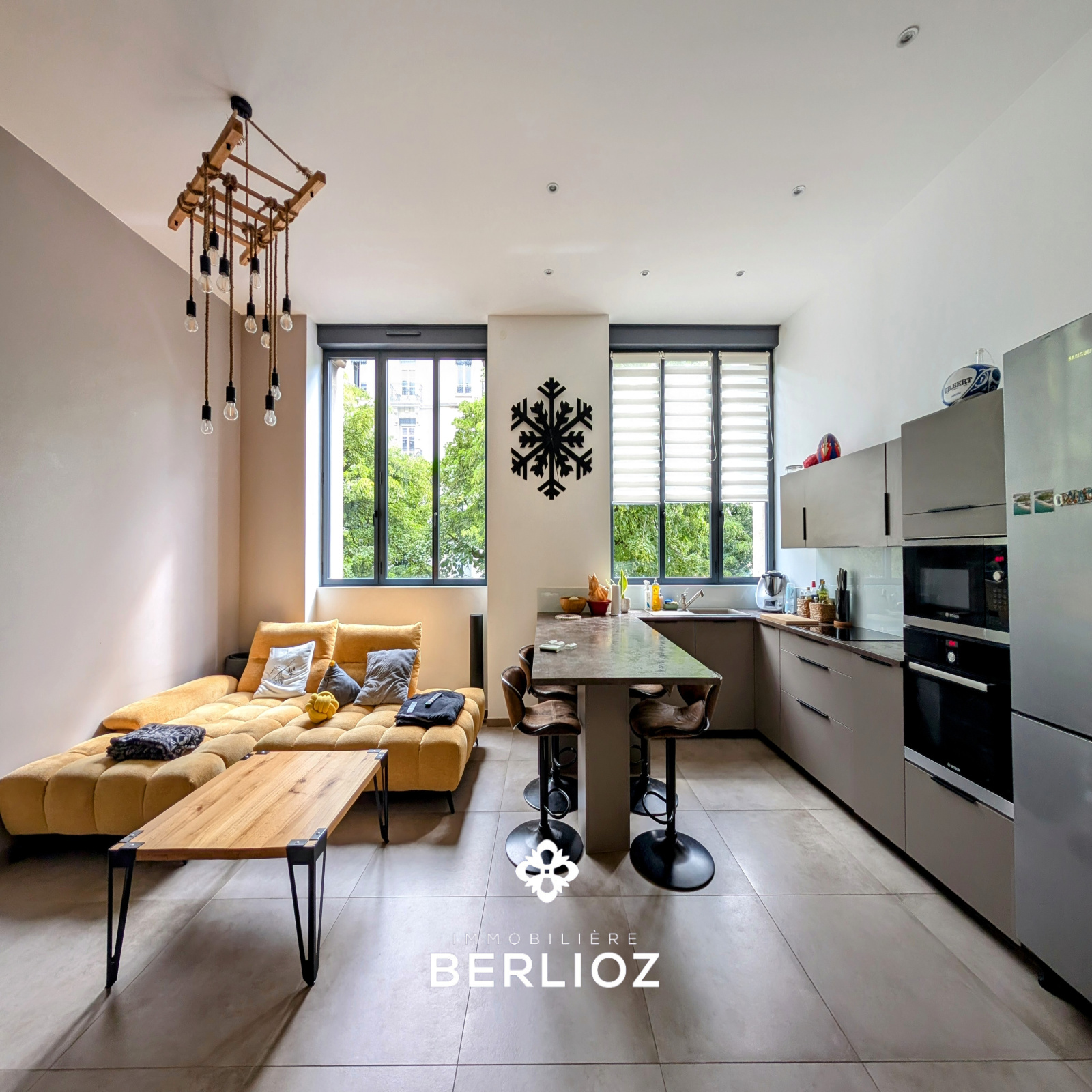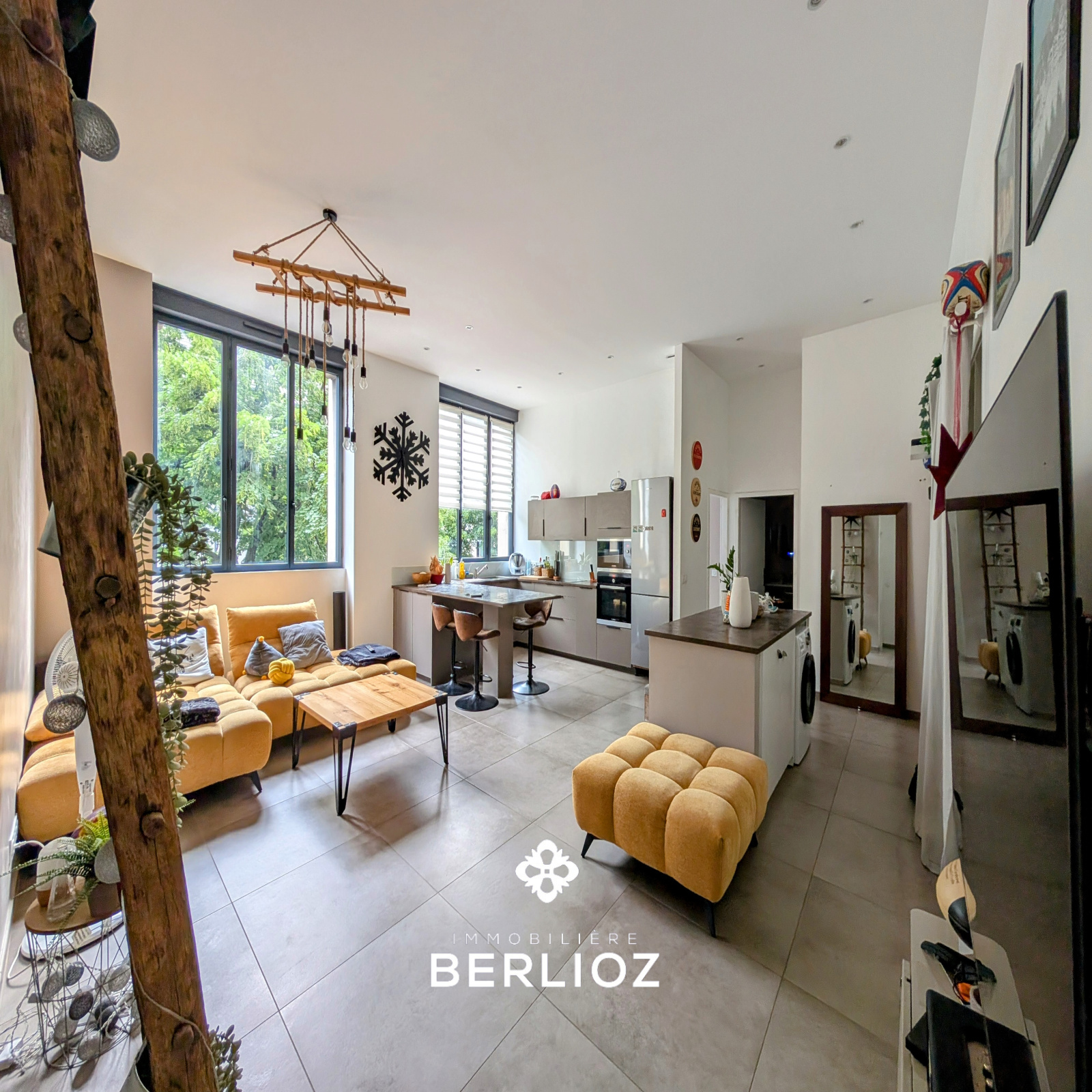 Situé au 1er étage sur entresol (équivaut à un 2ème étage) avec ascenseur, ce T3 de 70m² carrez (80m² utile), vous accueil avec une pièce de vie de 40m², cuisine équipée avec un très bel ilot centrale et une grande hauteur sous plafond.
