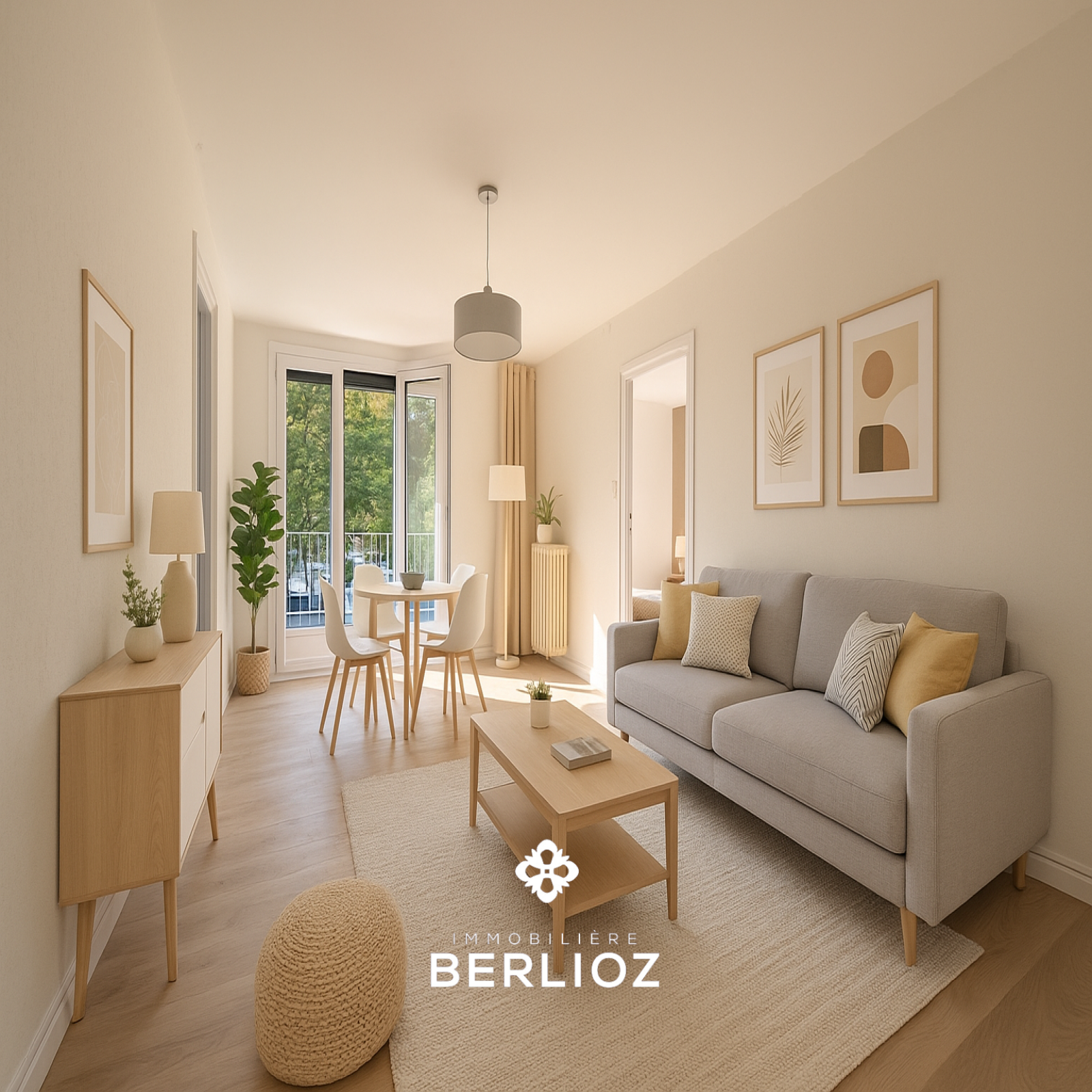 Cuisine et salon qui donnent sur le balcon orienté à l'Ouest, deux chambres, salle de douche moderne et wc séparés, plusieurs placards.